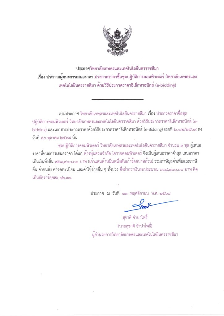 ประกวดราคาชื้อชุดปฏิบัติการคอมพิวเตอร์ วิทยาลัยเกษตรและเทคโนโลยีนครราชสีมา